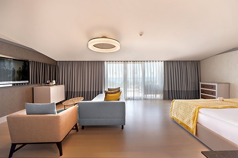 PENTHOUSE SUITE SEA VIEW is 614 square feet and includes a king-size bed 150-183 width plus balcony, satellite tv , hairdryer, safe, and slippers and is Wheelchair-accessible.